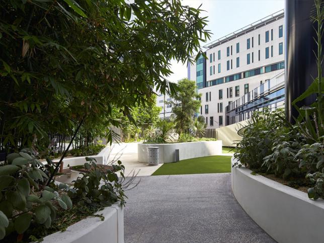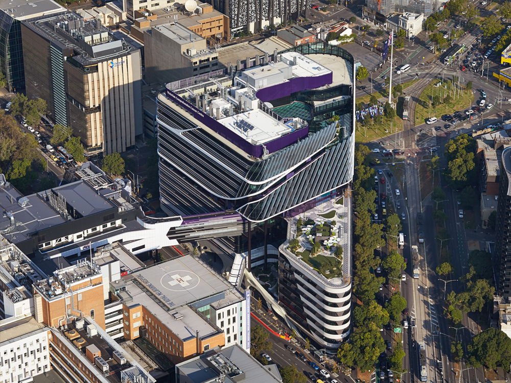 The new building and the extension to the Royal Melbourne Hospital are linked by covered bridges above Grattan Street, allowing patients, visitors and staff to move between the two buildings.