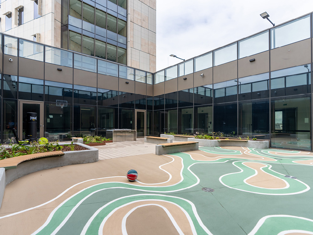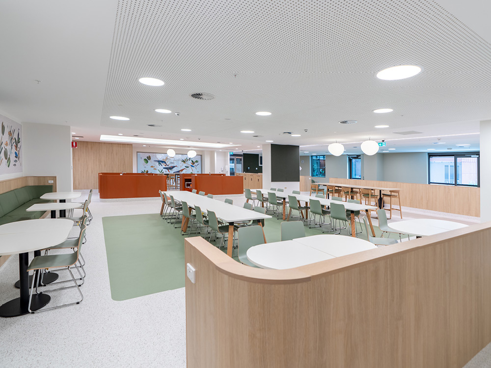 This is reflected in the landscaping with local indigenous plants, Welcome to Country installations, wall graphics, and themed floors with natural materials and Aboriginal storytelling.